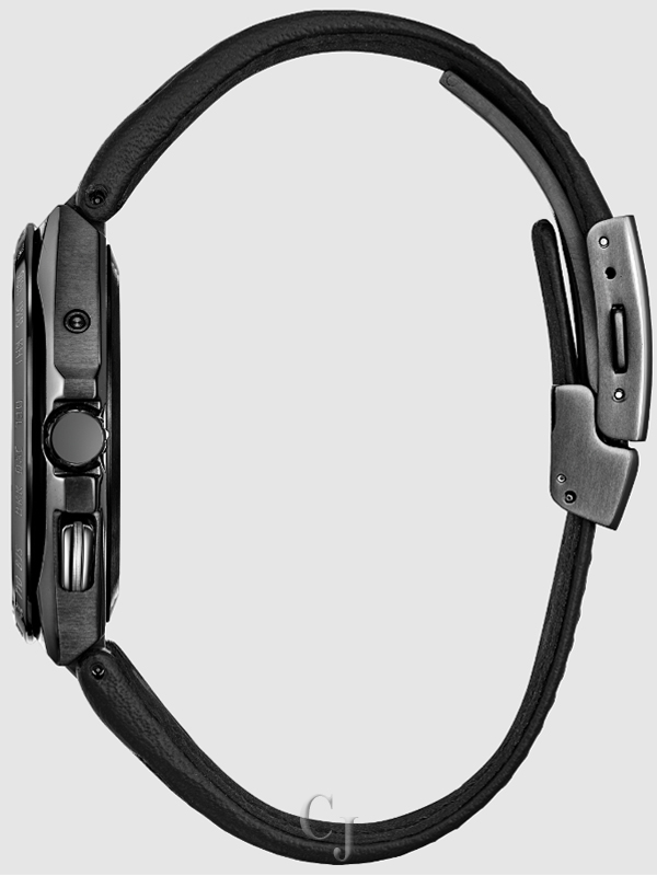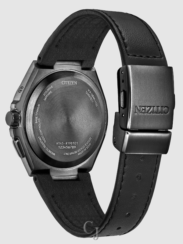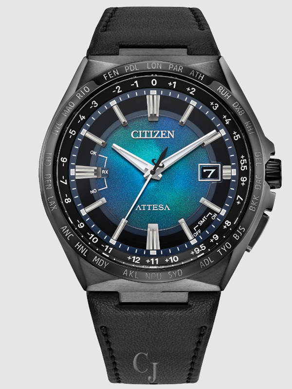 Inspired by the beautiful oceans that unite the world, the watches of Citizen’s UNITE with BLUE series join the colors of the seven seas on one 100% recycled polycarbonate dial. This example, which comes as part of the technology-driven Attesa collection, marks a unique take on the elevated luxury sports style. A 42.5mm scratch-resistant Super Titanium™ case in black DLC and a matching integrated leather strap solidify the lightweight, durable construction of the timepiece. On the special UNITE with BLUE iridescent dial, flowing hues of azures and greens meld into each other for a captivating aesthetic of sustainable style, while upon it, a time-and-date display is at work, with silver-tone accents adding dimension. Advanced features of the timepiece include world time in 26 time zones and a perpetual calendar. Featuring our sustainably light-powered Eco-Drive Atomic Timekeeping functionality, the timepiece self-adjusts to time or calendar when traveling overseas by receiving local time signals in four different regions. Water resistant up to 100 meters. Caliber H145.