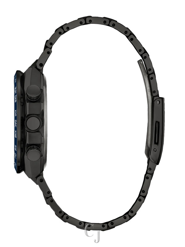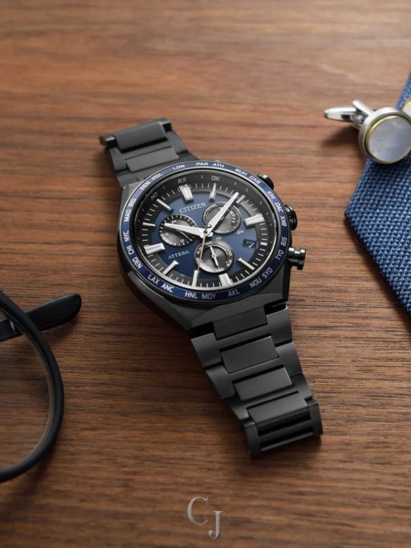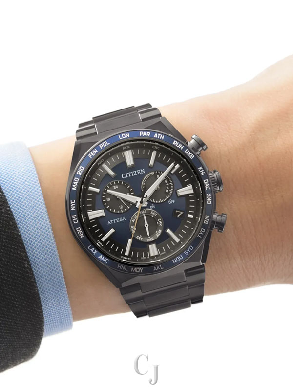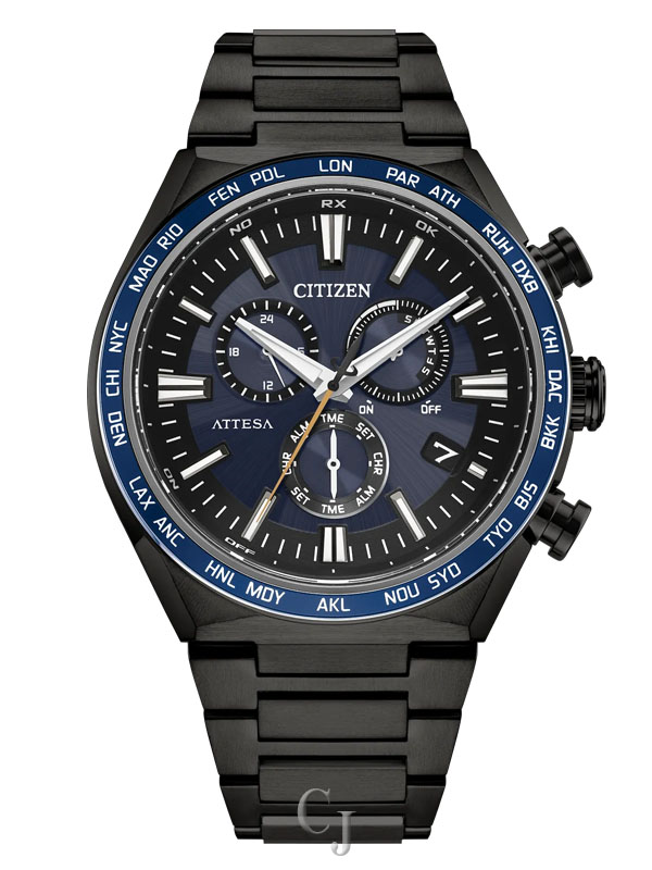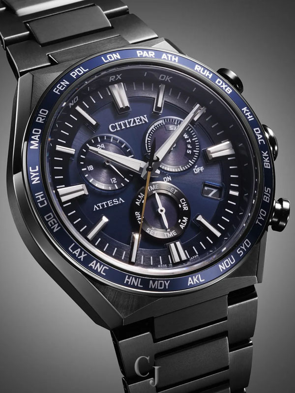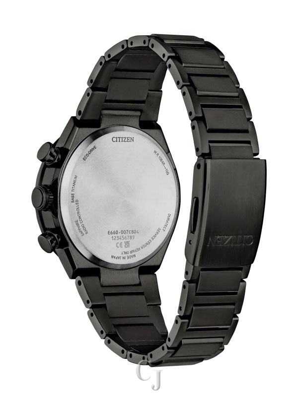 Other advanced features include a 24-hour display, 60-minute chronograph, direct flight world time (24-hour difference), and a summer time function alarm. Featuring light-powered Eco-Drive Atomic Timekeeping functionality, the timepiece self-adjusts when traveling overseas by receiving local time signals for 24 time zones. Caliber E660.