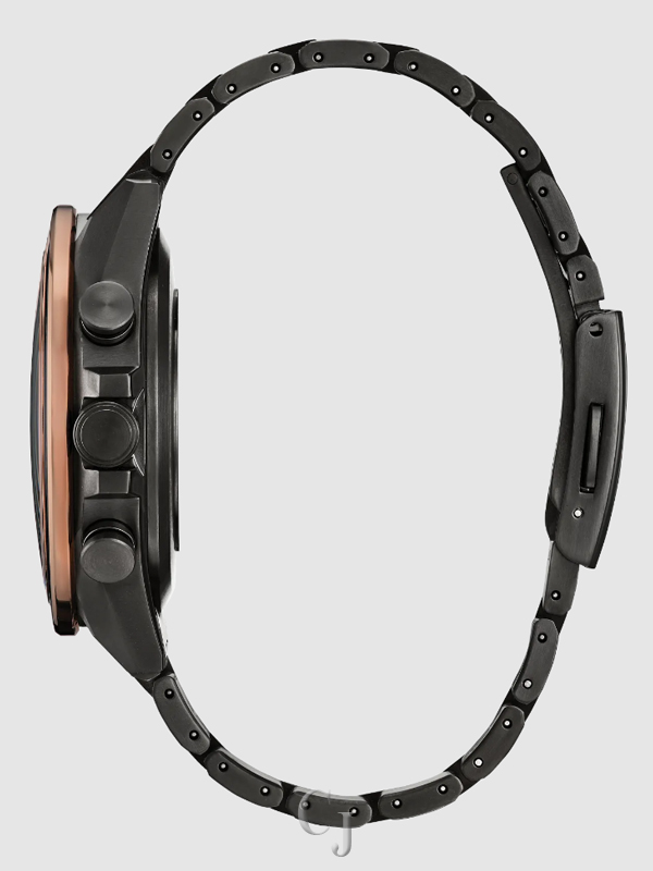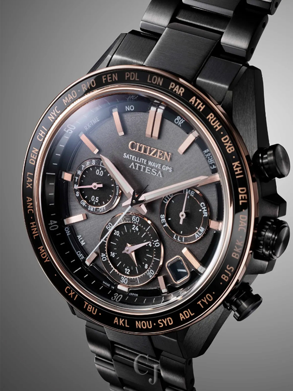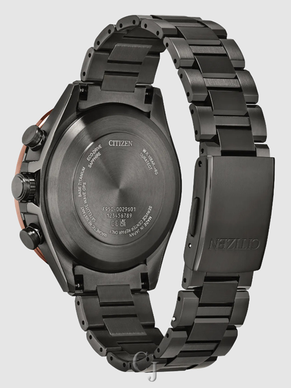 Other advanced features include world time in 27 cities (40 time zones), a 1/20 second chronograph, dual time zones, (UTC) universal coordinated time display, a perpetual calendar, as well as daylight savings time, and power reserve and light level indicators. This model features the most advanced movement for Eco-Drive Satellite Wave GPS watches, and delivers the world’s fastest time-only signal reception in as little as 3 seconds. The ultra scratch-resistant Attesa is powered by Citizen’s proprietary Eco-Drive technology, so it never needs a battery. Water resistant up to 100 meters. Caliber F950.