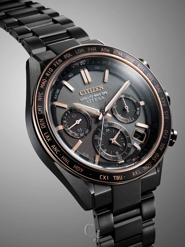Powerful design and advanced technology drive the luxury Attesa. Since its 1987 launch, the Attesa has delivered dependable performance via expert titanium-processing know-how and innovative chronograph technology, and the latest addition to the collection is no different. A 44.6mm Super Titanium™ case and bracelet solidify the lightweight, durable construction of the timepiece, while a gray DLC colorway alongside a duo of chronograph pushers and crown guards provide a sleek and sporty touch. A world time bezel frames the brown dial and its three registers, with applied rose gold-tone accents and a date window between 4 and 5 o’clock adding dimensionality alongside utility.
