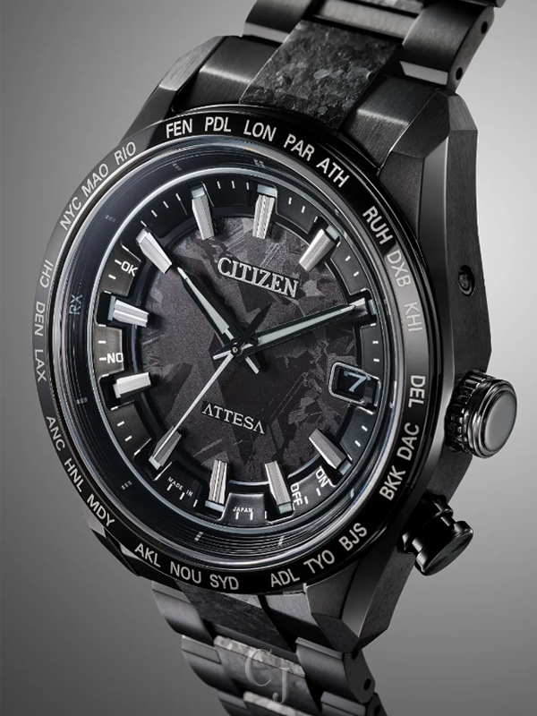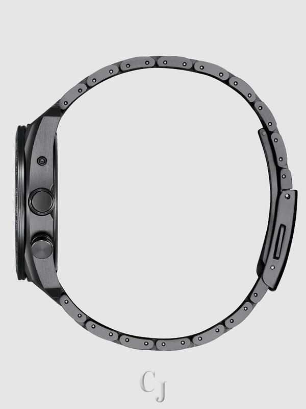 On the special detailed dial, a captivating time-and-date display is at work, with black and applied DLC accents adding dimension. Advanced features of the timepiece include world time in 26 time zones and a perpetual calendar. Featuring our sustainably light-powered Eco-Drive Atomic Timekeeping functionality, the timepiece self-adjusts to time or calendar when traveling overseas by receiving local time signals in four different regions. Water resistant up to 100 meters. Caliber H145.