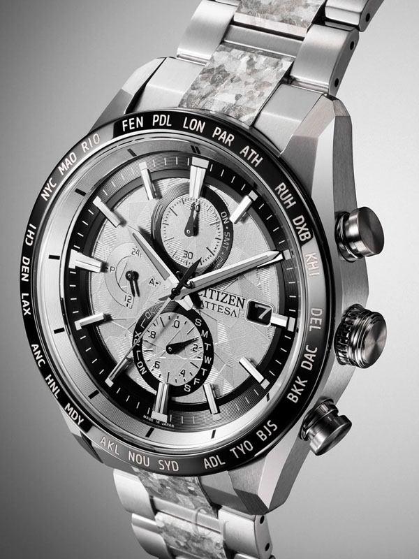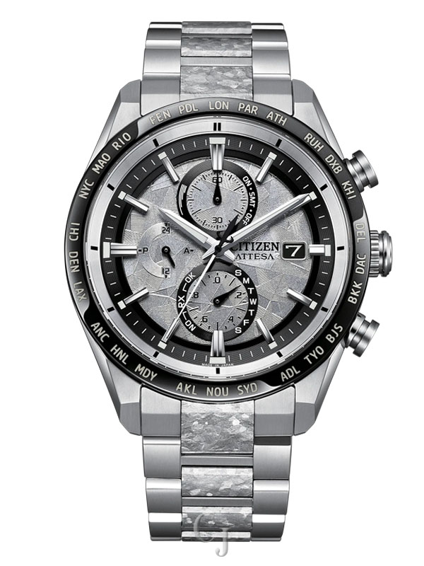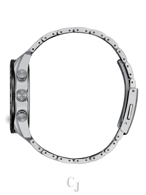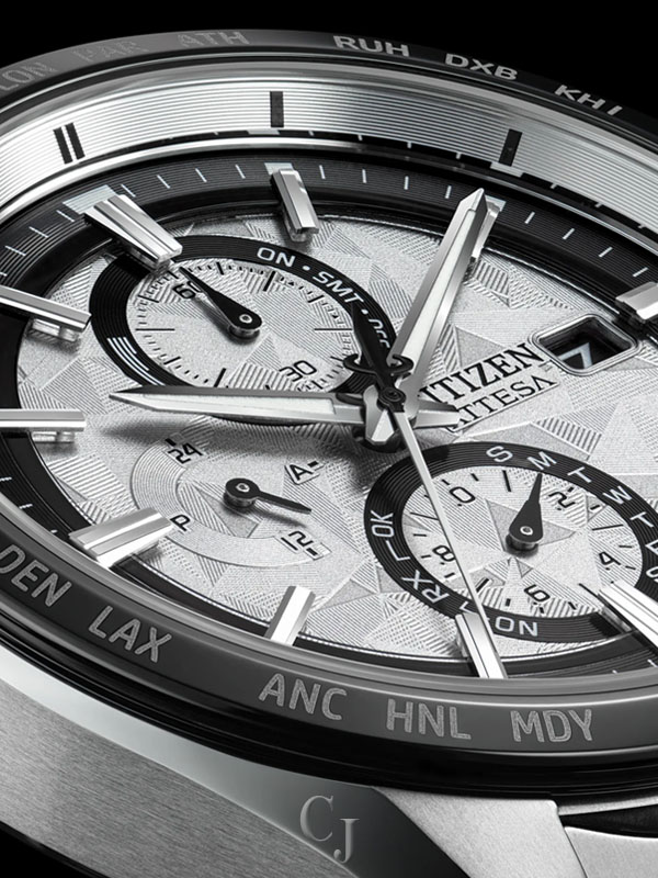 On the silver-tone dial, a matching texture to the bracelet is found, while a vertical three-register chronograph is at work. Black and gray details alongside applied details bring dimensionality, while a 3 o’clock date display provides daily utility. Other advanced features include world time in 26 time zones, a perpetual calendar with day and date indicators, 12/24-hour timekeeping, and a power reserve display. Featuring Eco-Drive light-powered Atomic Timekeeping functionality, the radio-controlled timepiece self-adjusts to time or calendar when traveling overseas by receiving local time signals in four different regions. Water resistant up to 100 meters. Caliber H800.