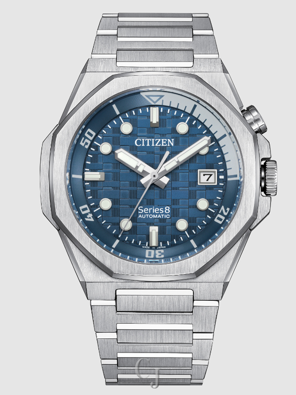 Balancing the worlds of robust wear and refined styling, the new timepiece features a 42.6mm octagonal silver-tone stainless steel case alongside the best of Citizen’s finishing techniques. With its matching integrated stainless steel bracelet and double set of crowns, the watch is ready for wear in any instance. Underneath a sapphire crystal, a textured blue dial with a rotating inner dive bezel is as captivating as it is practical, playing in the light while being highly legible on account of its applied indices and the smart design of its hands. A 3 o’clock date window adds even more utility to the design, while the hand-assembled automatic mechanism, with an accuracy of +20 / -10 seconds per day, powers it and secures the timepiece against strong magnetic fields. Water resistant to 200 meters. Caliber 9051.