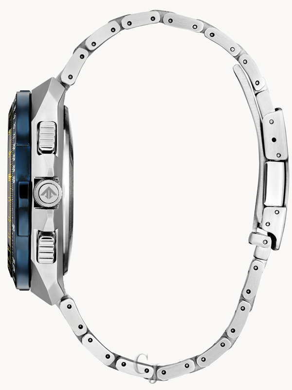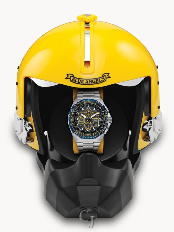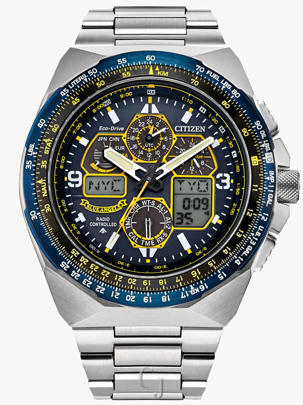 The mission of the Blue Angels is to showcase the pride and professionalism of the U.S. Navy and Marine Corps through their expert precision and dedication to excellence and service. Citizen is proud to present the latest Promaster Blue Angels Air Skyhawk men’s watch in a Special Edition box set. With only 9,999 pieces made worldwide, this exceptional timepiece has a silver-tone stainless steel case with a blue dial and blue ion-plated bezel encased in sapphire crystal. It features atomic time clock synchronization for superior accuracy, time adjustment available in 43 world cities, 1/100 second chronograph measures up to 24 hours, perpetual calendar, GMT dual time (second time zone), 2 alarms, 99-minute countdown timer, digital backlight display, Universal Coordinated Time (UTC) display, and a power reserve indicator. The silver-tone stainless steel bracelet band fastens with a fold over clasp with hidden push buttons. The Blue Angel’s insignia is replicated on the case back. This distinctive sports watch utilizes our Eco-Drive technology that’s sustainably powered by light and never needs a battery, and is water resistant up to 200 meters. Reach a higher altitude in style and pay tribute to the elite Blue Angels with this high-performance timepiece. The special edition version of the Blue Angels comes with a yellow helmet case and is the ultimate collector’s box set to own.