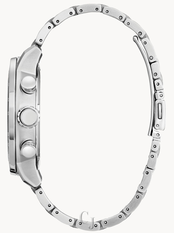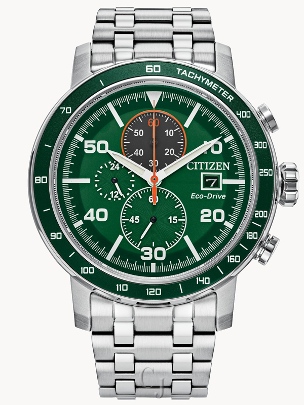 Effortlessly combining technological functionality with rugged sports watch design, the Brycen is a spirited expression of contemporary Citizen design. The robust silver-tone stainless steel case measures 44mm in diameter and has two distinct pushers on either side of the crown. Secured to the wrist by a silver-tone stainless steel bracelet, the timepiece is comfortable on the wrist and ready-for-anything with its water resistance to 100 meters. The green display of the chronograph is accented with vibrant red details and framed by a matching verdant bezel, creating an ultra-sporty appearance from case to dial. Features of the timepiece include a 1/5 second chronograph measuring up to 60 minutes, 12- and 24 hour time, and date indication. Powered by Citizen’s proprietary Eco-Drive technology to provide light-powered vitality continuously and sustainably without ever needing a battery. Caliber B612.