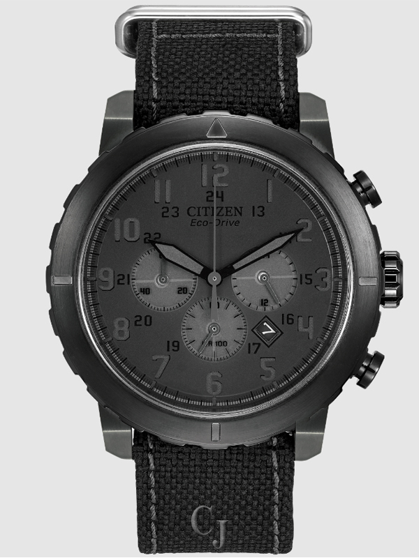Stand at attention with this rugged military-inspired chronograph timepiece with slip-thru canvas straps with metal rings that keep the watch in place. In a stealthy black-on-black theme of stainless steel with a black strap and dial. Additional features include a 1/5-second chronograph that measures up to 60 minutes, 12/24-hour time and date. Featuring our Eco-Drive technology – powered by light, any light. Never needs a battery. Caliber number B620.