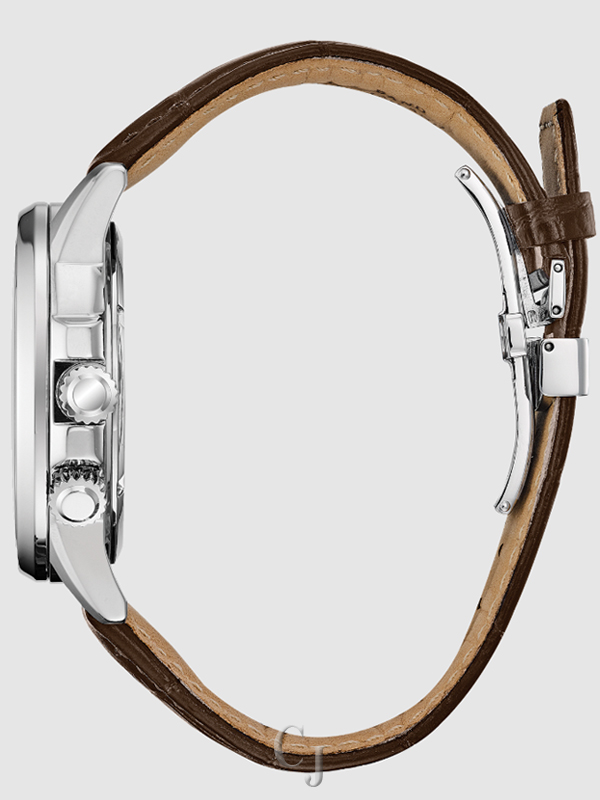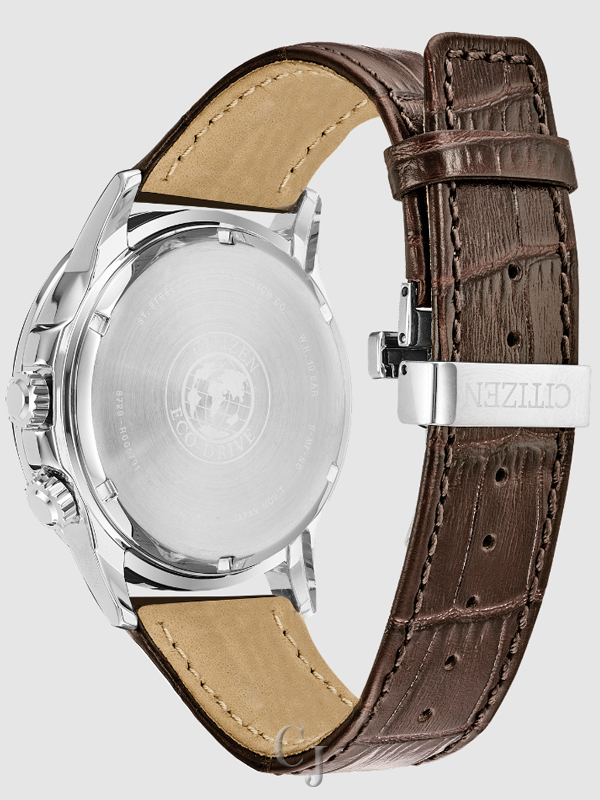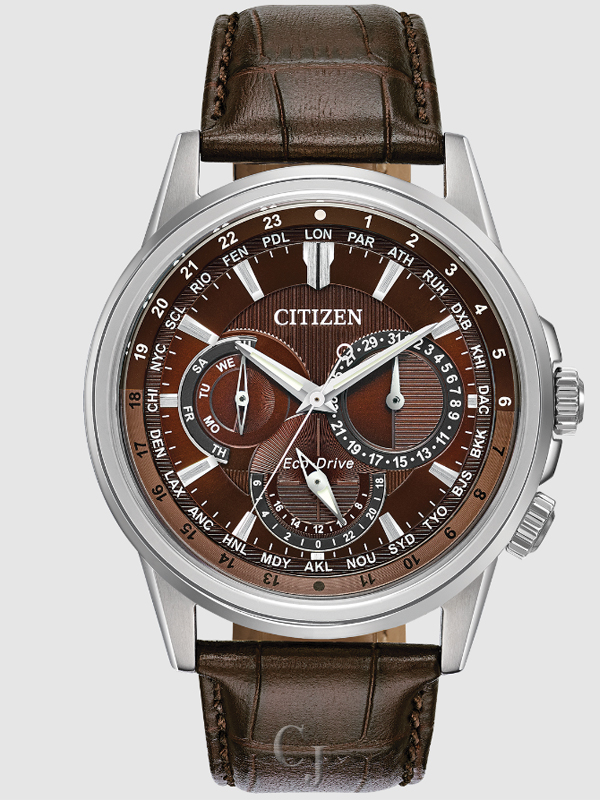 Bring sophistication to your day with the CITIZEN® Calendrier, powered by any light with Eco-Drive. This timeless watch features 12/24-hour time, world time in 24 cities and day/date. Men’s watch featured with stainless steel case, chocolate brown leather strap with matching brown dial. Featuring our Eco-Drive technology – powered by light, any light. Never needs a battery. Caliber number 8729.