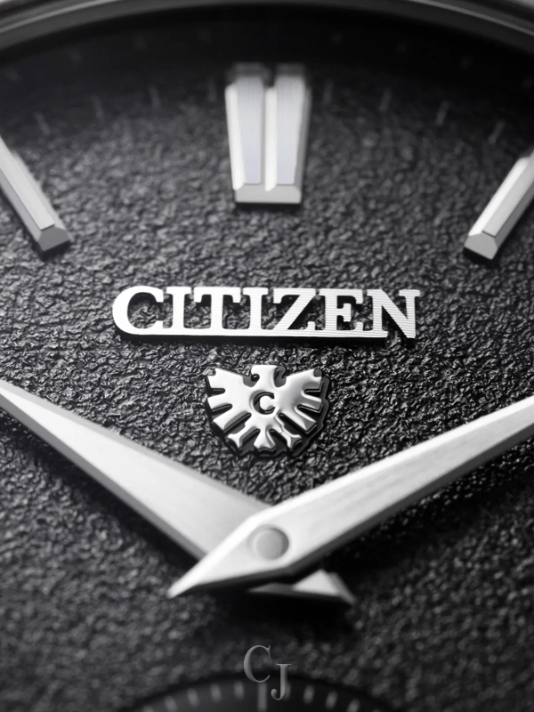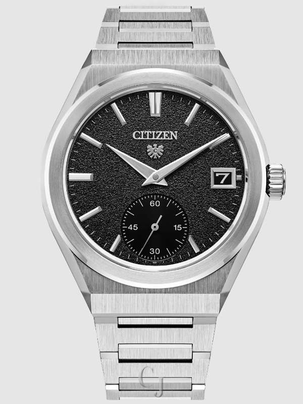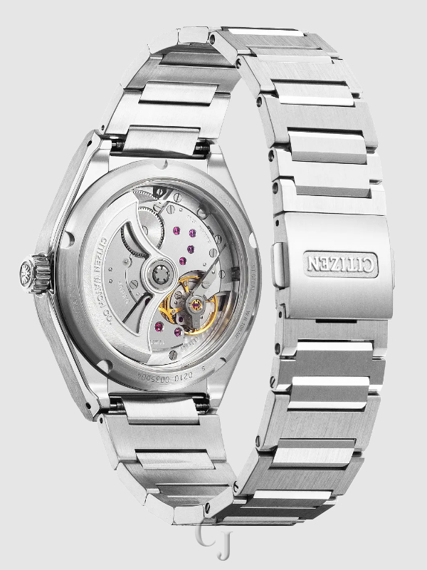 A sapphire crystal protects the grained black dial, with an electroformed sand-ripple pattern presenting a delightfully subtle interplay between light, texture, and color. Toward the top of the display is the collection’s signature eagle mark, symbolizing the twin ideals of The CITIZEN – foresight and dedication to the pursuit of ideals, as well as the enduring connection between watch and wearer. Inside, the Citizen Caliber 0210 is at work, with the automatic movement accurate to -3 to +5 seconds per day and visible with its skeletonized rotor via an exhibition case back. Water resistant to 100 meters.