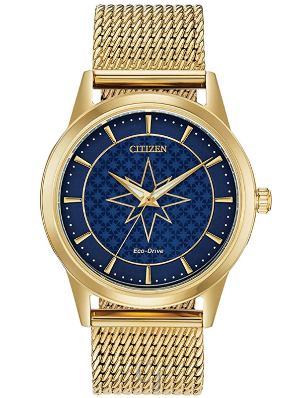 Citizen Captain Marvel Quartz Movement Blue Dial unisex Watch FE7062-51W. 40 mm stainless steel round case with blue dial and mineral crystal. Luminescent hands. Minute marker around the rim and logo beneath the 12 o’clock position. It comprises index markers in addition to the hour, minute and second clock hands. 9 mm case with push / pull crown and 21 mm wide gold bracelet including a sliding clasp. Quartz movement and water resistance up to 50 meters. Stainless steel mesh bracelet. Style: Casual watches. Caliber: J830. Captain Marvel series.