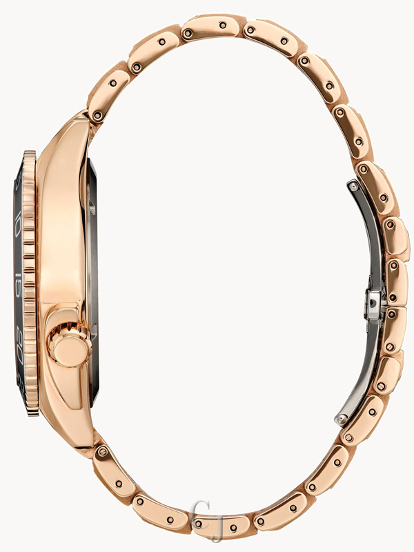 Our newest addition to the Sport Luxury collection gives a stylish update to a luxury men’s timepiece. Designed to be versatile yet elevated featuring a rose-gold tone stainless steel case and bracelet with black 3-hand dial encased in sapphire crystal, date function and a deployment clasp with push buttons for easy accessibility. Water resistant to 100 meters and sustainably powered by light with Eco-Drive that never needs a battery. Caliber number J810.