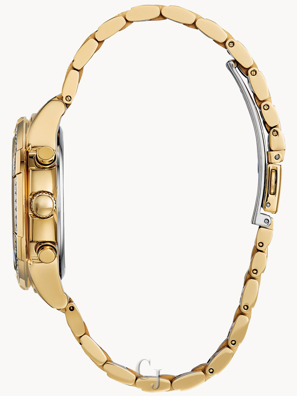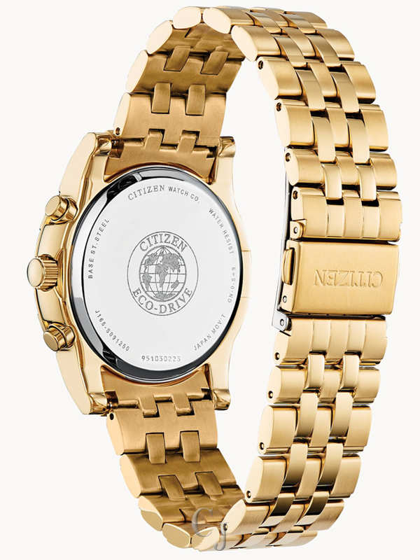 Bring sophistication to your day with the CITIZEN Crystal. This timeless chronograph watch features 12/24-hour time and date. Men’s watch featured with gold-tone stainless steel case and bracelet with black dial adorned with a crystal bezel. Featuring our Eco-Drive technology – powered by light, any light. Never needs a battery. Caliber number H500.