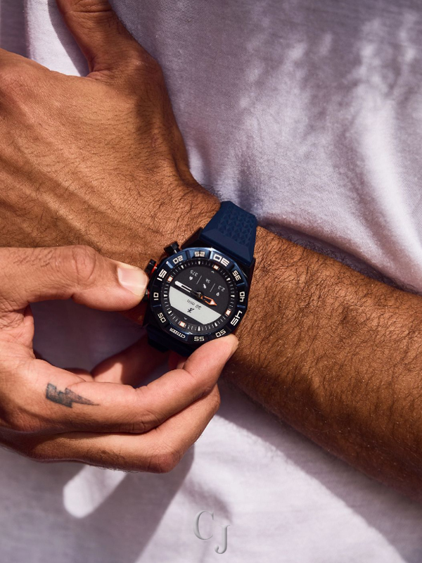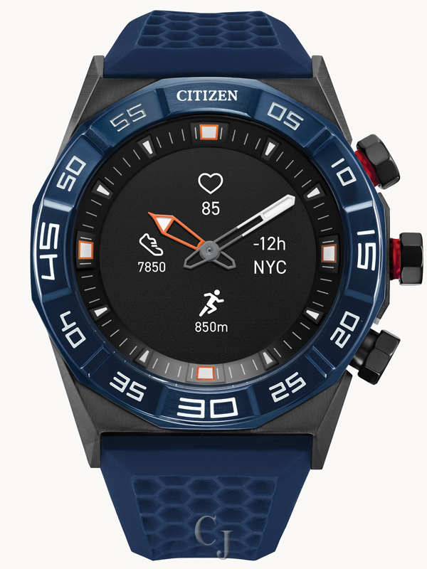 Introducing a genius timepiece like you’ve never seen before – the new CZ Smart hybrid has all the style of iconic Citizen design combined with the best-tech functions of a smartwatch. The impressive 15-day battery keeps up with your busy lifestyle in a distinctive design that stands out. This new CZ Smart hybrid watch features a black ion-plated stainless steel sport bezel in blue and a 44mm case with functioning dials on the black and white display with pops of orange on the pushers and luminous analog hands. The blue silicone integrated strap blends with the overall design and fits perfectly on your wrist. Utilize the Citizen Connected app to manage your notifications, change your dials and see your fitness stats. Stay on track with the convenience of information at a glance on your hybrid smartwatch display. You can choose the dial that fits your mood or style and customize the information on display to meet your needs including, steps, weather, heart rate, and more. *CZ Smart Functions require the Citizen Connected app, available in the UK/US/CANADA/MEXICO app stores only.