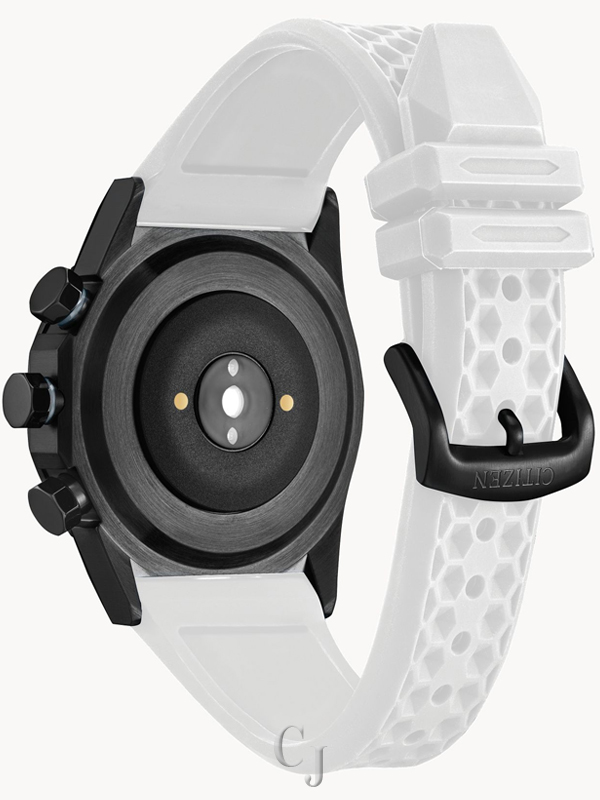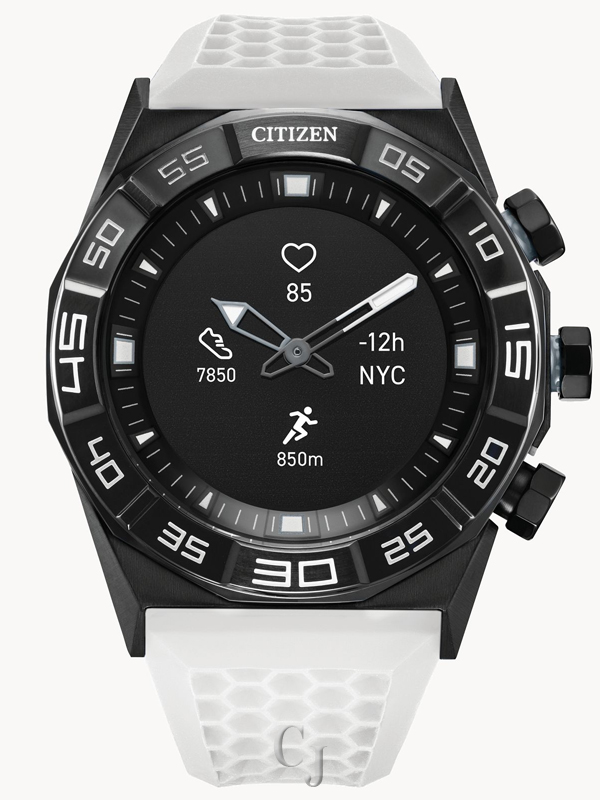 Introducing a genius timepiece like you’ve never seen before – the new CZ Smart hybrid has all the style of iconic Citizen design combined with the best-tech functions of a smartwatch. The impressive 15-day battery keeps up with your busy lifestyle in a distinctive design that stands out. This new CZ Smart hybrid watch features a black ion-plated stainless steel sport bezel and 44mm case with functioning dials on the black and white display with luminous analog hands. The white silicone integrated strap blends with the overall design and fits perfectly on your wrist. Utilize the Citizen Connected app to manage your notifications, change your dials and see your fitness stats. Stay on track with the convenience of information at a glance on your hybrid smartwatch display. You can choose the dial that fits your mood or style and customize the information on display to meet your needs including, steps, weather, heart rate, and more. *CZ Smart Functions require the Citizen Connected app, available in the UK/US/CANADA/MEXICO app stores only.