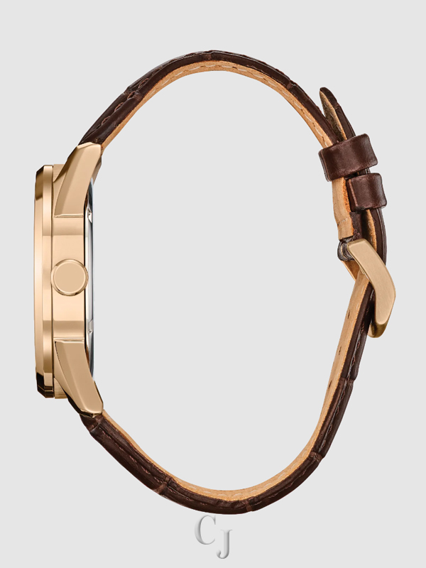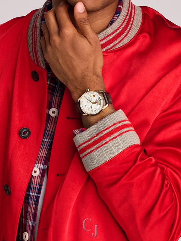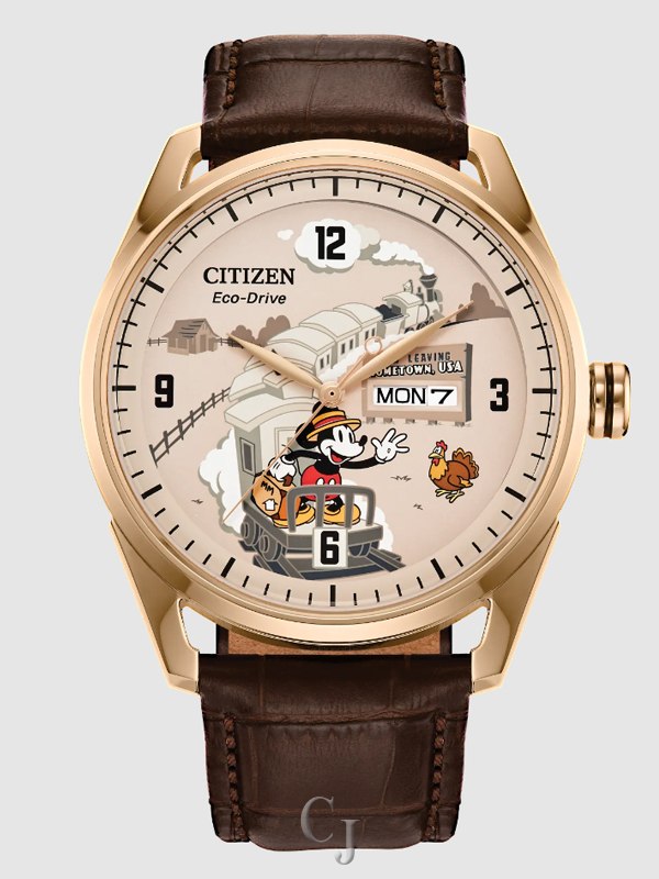 Disney Mickey Mouse embarks on a journey with four unique destinations. The first stop is where it all started: Walt Disney’s storied boyhood home of Marceline, Missouri. The sepia-toned dial featuring original artwork by Disney artists John and Shelley Loter depicts Mickey Mouse departing his hometown on an old-fashioned steam engine, with a replica of Walt Disney’s family barn and encircled by a minute track that resembles train tracks. The case back is etched with a retro suitcase with a destination sticker surrounded by the words “Time to Fly” and “Since 1928”—the year Mickey Mouse first appeared on the silver screen. The gold-tone stainless steel 42mm case and embossed brown leather strap add to the vintage vibes. Plus, this watch is sustainably powered by any light with our proprietary Eco-Drive technology and never needs a battery.