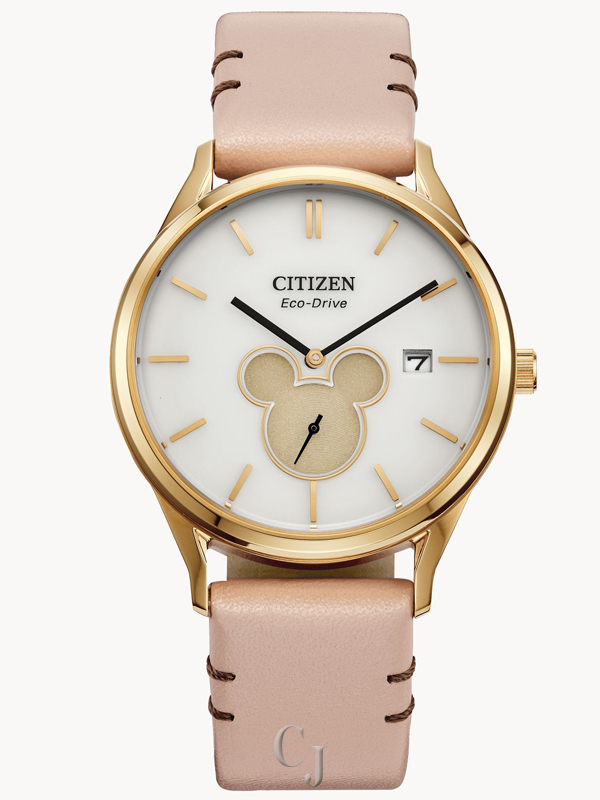 Mickey means business in this elegantly understated blend of form and function from the Disney x Citizen Mickey Mouse collection. With its clean, modern, unisex styling, the new Mickey Shadow timepiece will make every day magical and bright. The gold-tone stainless steel case features an ivory sunray 2-hand dial with date and a sub dial in the cut-out iconic Mickey Mouse silhouette. The natural leather buckle strap is accented with contrasting safety stitching for added appeal. Powered by Citizen’s Eco-Drive technology, the watch never needs a battery. Wearing this exquisite watch will make it easy to think happy thoughts.