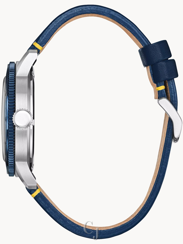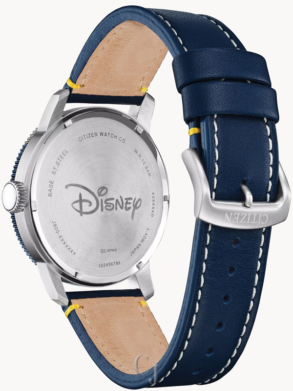 Don a Disney Donald Duck timepiece from CITIZEN, inspired by the original best friend. Feisty and flustered at times, Donald Duck peeks through the 4 and 5 o’clock markers against a blue gradient dial with yellow accents. Inspired by his sailor attire, a nautical theme prevails in navy blue with an anchor on the dial at 12 o’clock. A stainless steel case with a blue ion-plated bezel, navy blue leather strap and yellow topstitch, fits true to this duck’s form with an additional day and date display. Citizen watches are powered by any light with Eco-Drive technology and never need a battery. ©Disney
