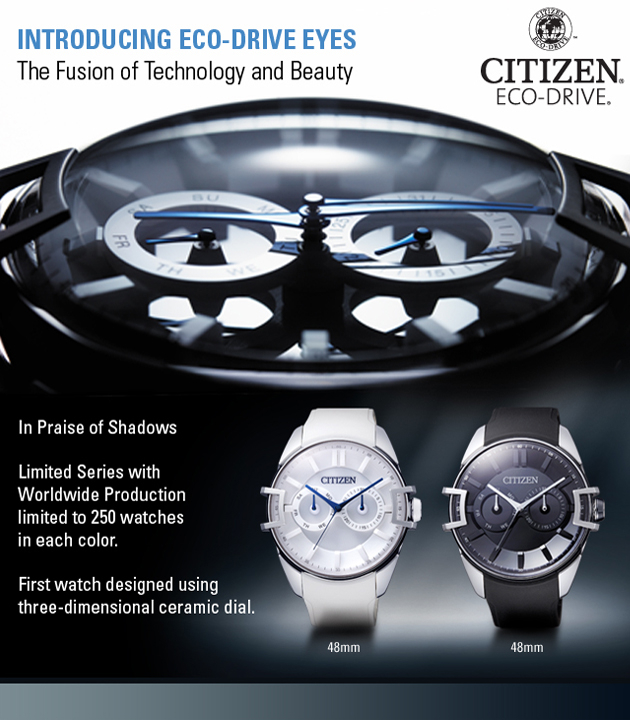 Citizen selected high-grade ceramic as the ideal material for the Eco-Drive EYES “Light and Shadow” concept.The smoothness, purity and solidness of ceramic demonstrated unique contrasting characteristics found with no other material. Ceramic is often fragile and difficult to handle. CITIZEN’s state-of-the-art precision processing technique made it possible to create the world’s first three-dimensional design using ceramic for the face of the watch.Citizen Eco-Drive technology harnesses the power of light – from any natural or artificial light source – and converts it into energy which is stored in a permanently rechargeable lithium-ion cell. It recharges continuously in any kind of light to run forever.