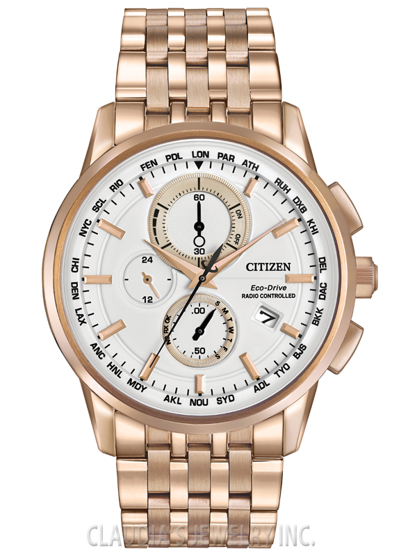 Citizen World Chronograph A-T, the ideal timepiece for the avid world traveler. Atomic timekeeping in 26 time zones, 1/20-second chronograph measures up to 60 minutes, perpetual calendar, 12/24-hour time, power reserve indicator, day, and date. Crafted with