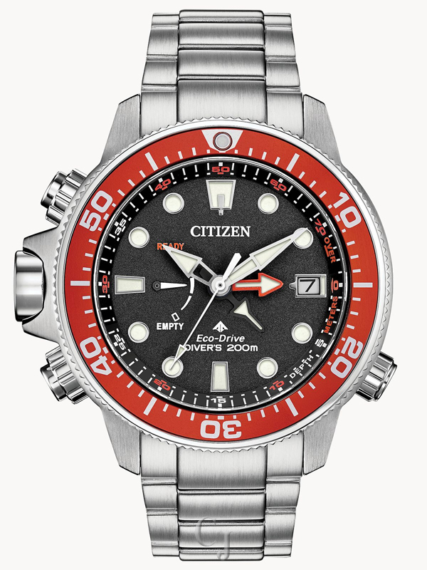 Ready, Set, Dive. An iconic name with a reinvented construction, the Citizen Promaster Aqualand ISO compliant watch with maximum depth memory, rapid ascent alarm, auto start dive mode and power reserve indicator with diver 200M, you won’t want anything else when headed to the ocean. Stainless steel case and bracelet compliment the black dial with bright orange bezel. Featuring our Eco-Drive technology – powered by light, any light. Never needs a battery. Caliber number J250.