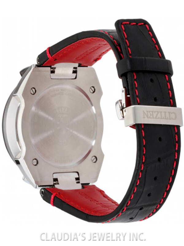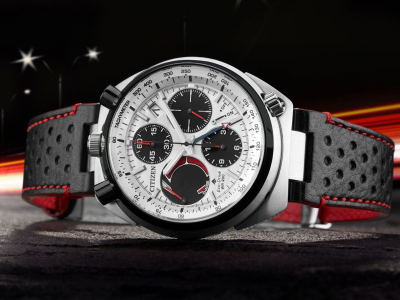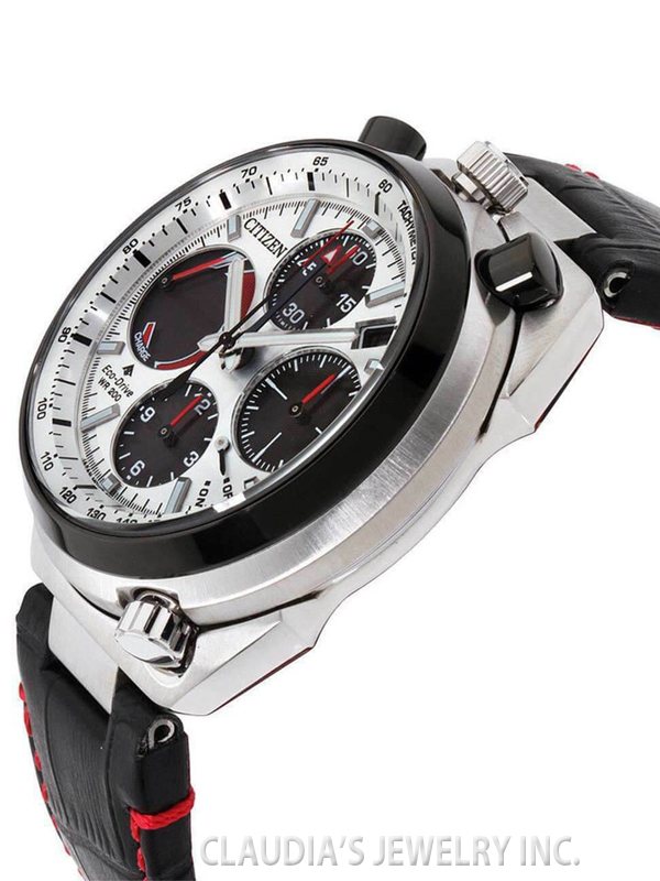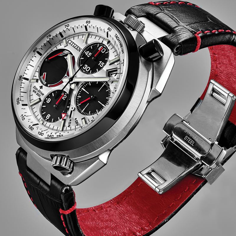 Paying homage to a retro 1973 CITIZEN Bullhead model, the newly modernized CITIZEN Tsuno Chrono Racer showcases a unique case styling, trendy color combinations and is sure to stand out on your wrist. A hand assembled movement, the Tsuno Chrono Racer features 1/5-second chrono, alarm, tachymeter, instantaneous fly back, power reserve and date. Seen here in a black ion-plated stainless steel case, black leather strap with red constrast stitching and black and silver dial. Featuring our Eco-Drive technology – powered by light, any light. Never needs a battery. Caliber number E210.
