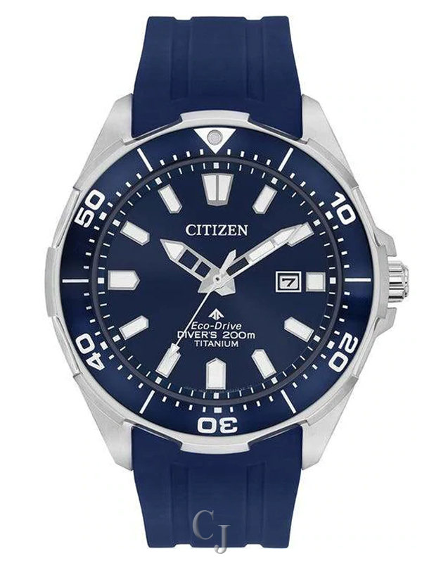 Prove that a dive watch can be fun and functional with the Citizen ISO-compliant Promaster Diver. With Eco-Drive technology, it is powered by light and never needs a battery, so you’ll never need to open your caseback or compromise your dive again. Featured with a Super Titaniumâ„¢ case, blue polyurethane strap and blue dial. Additional features include an aluminum ring on the bezel, one-way rotating elapsed time, screw-back case, screw-down crown and WR200.