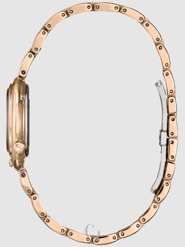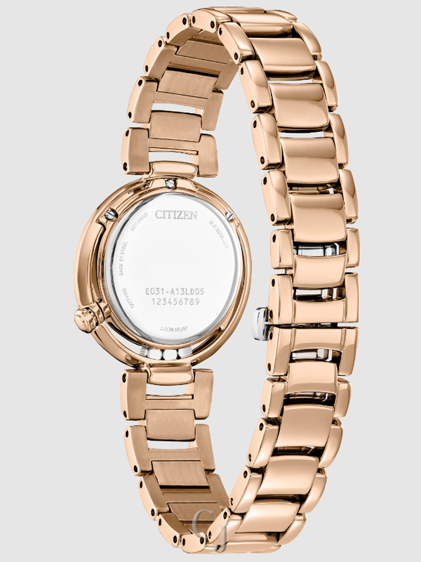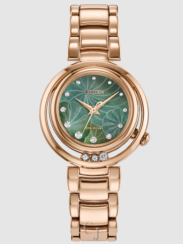 Classic lines and hints of romance make this newest piece to our women’s collection, the Citizen L Arcly, a captivating addition of sustainable luxury. With a design inspired by the original Citizen “Sunrise,” the distinctive rose gold-tone stainless steel timepiece is a charming accent on the wrist that’s perfect for glamorous wear. Sleek lines define the watch’s 29.8mm silhouette, with a subtle 4 o’clock crown and 7 o’clock diamond accent adding to its entrancingly delicate look. On its green-tinged mother-of-pearl dial, applied diamond markers and sharp hands indicate the time in style atop a subtle flower motif, keeping the attention on the pure aestheticism of the timepiece. Sustainably powered by any light with our proprietary Eco-Drive technology that never needs a battery, this elegant ladies’ watch is the perfect addition to elevate any outfit. Caliber E031.