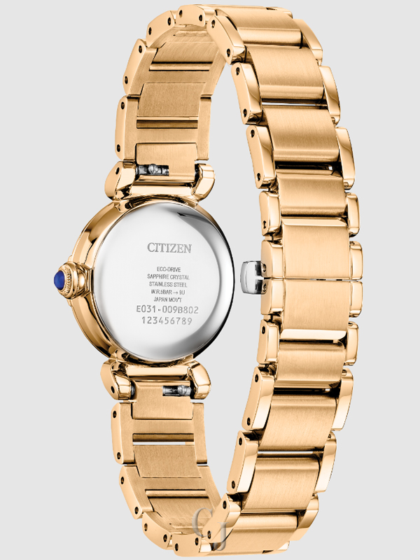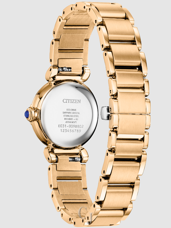 Featuring a gradient green dial made of recycled materials, including a recycled polycarbonate base under the dial, the display is showcased via a sleek, rose gold-tone stainless steel case and bracelet. The dial also has a diamond that gives focus to the 8 o’clock position and is finished with a sapphire crystal. Sustainably powered by any light with our proprietary Eco-Drive technology that never needs a battery, this elegant ladies’ watch is the perfect dressed-up look with high-powered performance and comes in a boxed set with an interchangeable brown leather strap. Caliber E031.