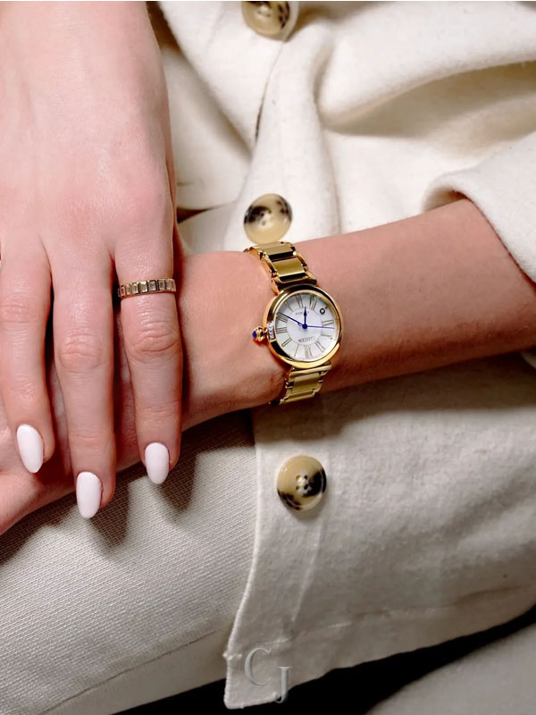 Classic lines and hints of romance make this newest piece to our ladies’ collection, the Citizen L Mae, a glamorous addition of sustainable luxury. With a case design inspired by a vintage perfume bottle and featuring the curved, sleek lines of May bells, the bezel shape has a distinct feature at the 3 o’clock position, where the crown resembles an elegant perfume stopper. Featuring a white, mother-of-pearl dial made of recycled materials, including a recycled polycarbonate base under the dial, and showcased on a sleek, gold-tone stainless steel case and bracelet. The dial also has a diamond that gives focus to the 8 o’clock position and is finished with a sapphire crystal. Sustainably powered by any light with our proprietary Eco-Drive technology that never needs a battery, this elegant women’s watch is the perfect dressed up look with high-powered performance. Caliber E031.