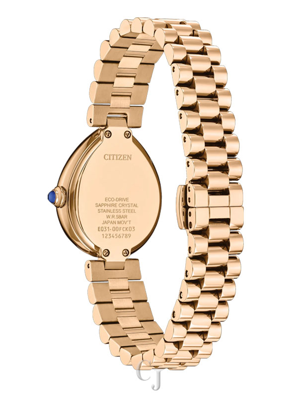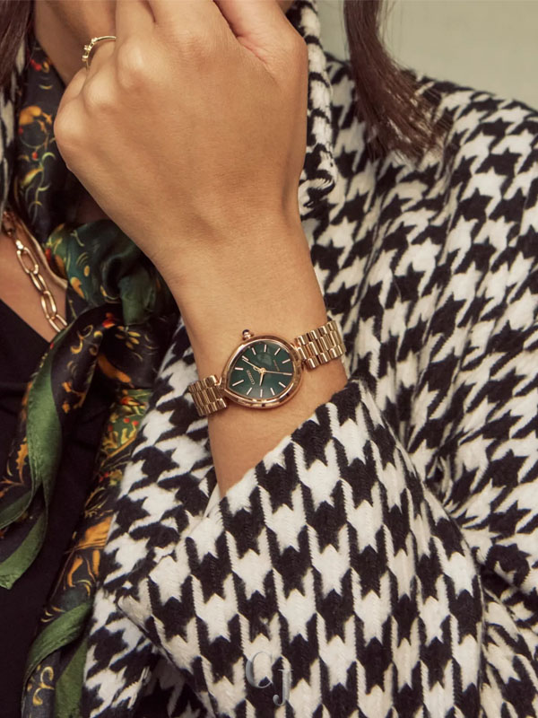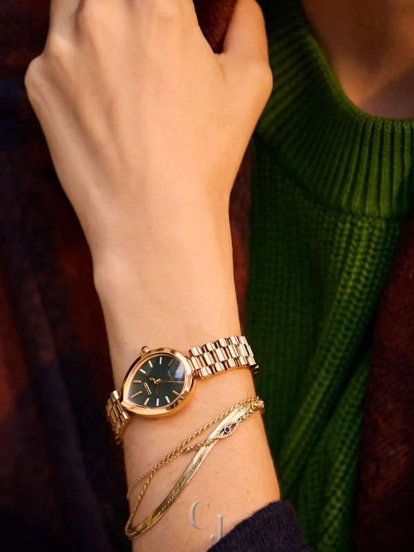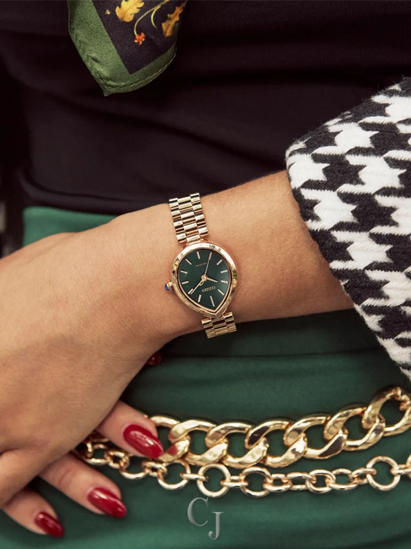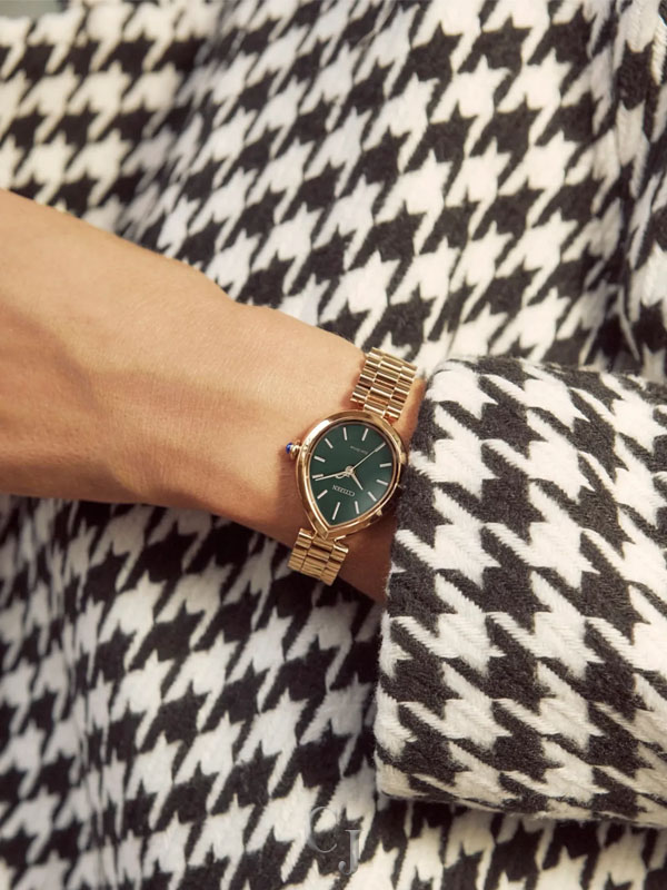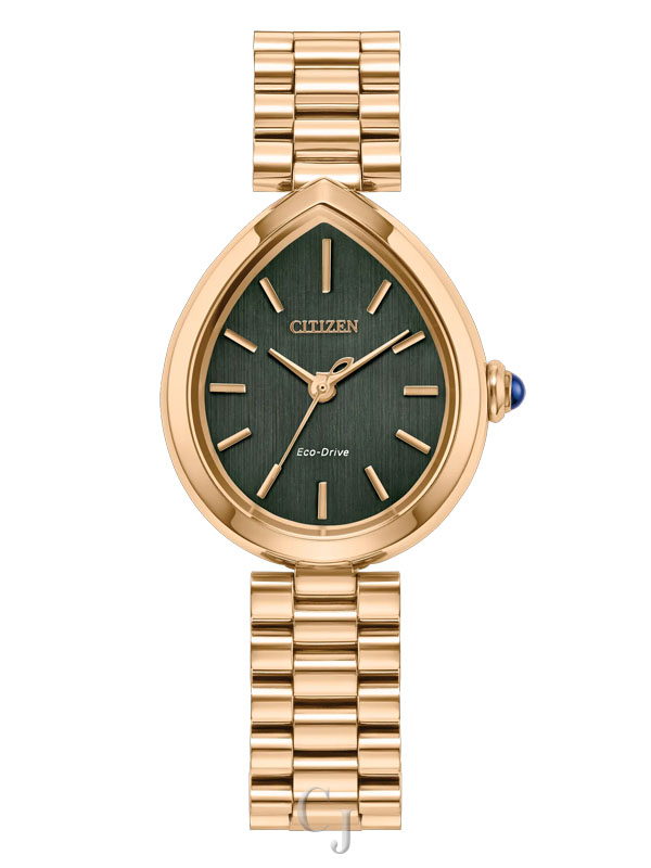 Flirty and feminine, the new Citizen L Rainell is a watch as creative and elegant as those who wear it. With subtle dimensions of 26mm by 31mm, the signature shape of the timepiece speaks for itself in an elevated rose gold-tone stainless steel. An integrated bracelet and synthetic sapphire-set crown punctuate the look. A lovely green dial follows the shape of the case, with a brushed background playing host to refined details in applied indices and matching hands. Sustainably powered by any light with our proprietary Eco-Drive technology that never needs a battery. Water resistant up to 50 meters. Caliber E031.
