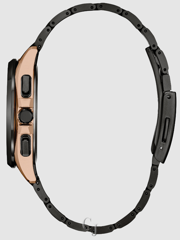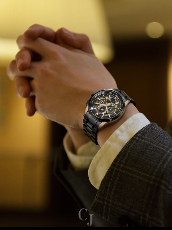 Beneath a sapphire crystal, a lunar-inspired background plays host to a vertical-configured chronograph display, with a 6 o’clock moonphase and a 4 o’clock date window balancing technological utility with intrigue for the eye. Powered by Citizen’s famed Eco-Drive technology to provide light-powered vitality without ever needing a battery, the watch makes use of Citizen’s proprietary new Luna Program– the world’s first fully automatic analog moon phase function for light-powered analog wristwatches. Water resistant up to 100 meters. Caliber H874.