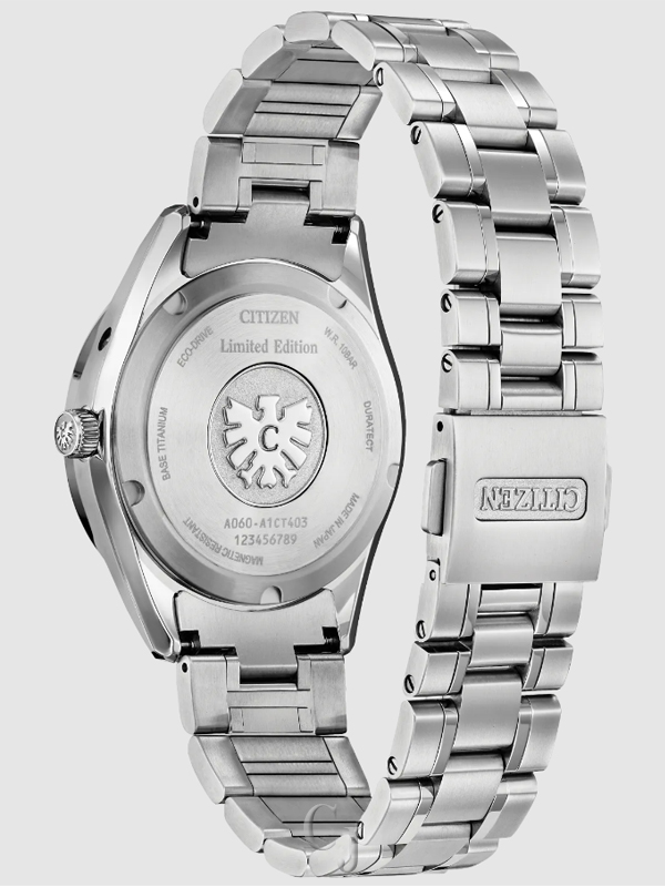 Inside the timepiece is the Citizen Caliber A060, accurate to ±5 seconds per year and equipped with Eco-Drive technology that’s sustainably powered by any light and never needs a battery. Advanced features include a perpetual calendar, power reserve indicator, insufficient charge warning, energy saving function, shock detection, automatic hand position adjustment, time difference correction, and midnight sharp calendar update function. Water resistant to 100 meters.