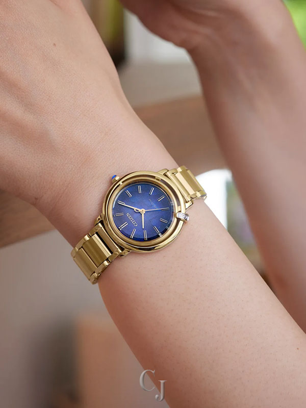 Classic lines and hints of romance make this newest piece to our women’s collection, the Citizen L Arcly, a glamorous addition of sustainable luxury. With a design inspired by the first Citizen “Sunrise,” the distinctive gold-tone stainless steel timepiece is a charming accent on the wrist that’s perfect for versatile wear.