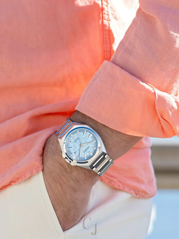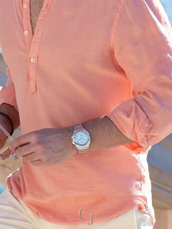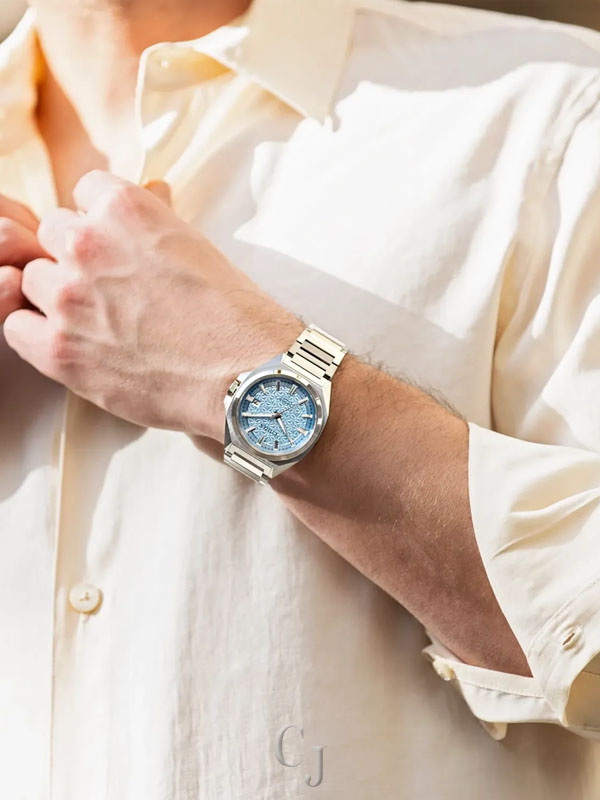 Its silver-tone stainless steel H-link bracelet continues the case’s refined use of brushed and polished finishing techniques, ensuring the watch is ready for wear in any instance. Underneath a sapphire crystal, a light blue textured dial is as captivating as it is practical, playing in the light while being highly legible on account of its applied indices and the sharp design of hands. A 3 o’clock date window adds even more utility to the design.