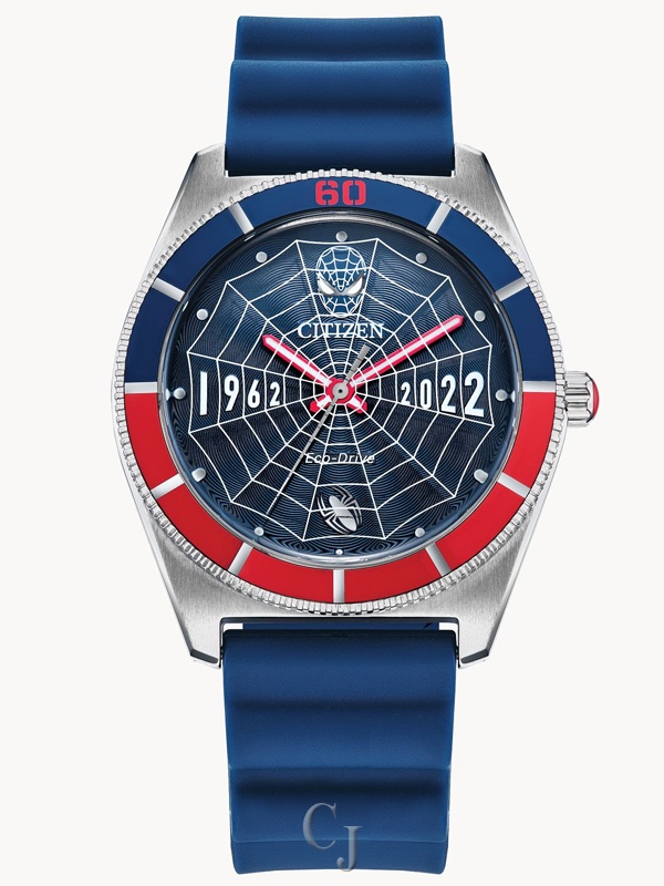 Are your Spidey senses tingling? Meet the latest addition to the Citizen’s Marvel men’s watch collection, the Spider-Man 60th Anniversary Limited Edition box set. This watch is limited to only 1962 made, in honor of the year Spider-Man first spun his web. The blue 3-hand dial features Spider-Man with luminous eyes surrounded by a web-like printed dial to create a dimensional effect. The anniversary dates 1962-2022 are also luminously displayed on the watch face, and the 60-minute mark is highlighted to celebrate the 60th anniversary. The silver-tone stainless steel case is contrasted by a blue polyurethane strap with a buckle closure. The case back further celebrates our hero with an etching of Spider-Man in his classic pose; encircling him is the phrase “Beyond Amazing”. This exceptional watch has Eco-Drive technology and never needs a battery. Completing the set are two Spider-Man pins. Spin your own web with this Beyond Amazing commemorative timepiece set.