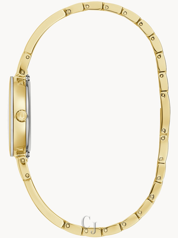 Bring the romance of Marc Anthony’s music to the wrist in this essential accessory that unites Bulova’s fine watchmaking and Marc Anthony’s iconic music in an exclusive collaboration. The new Bulova Marc Anthony Modern Bangle ladies’ watch highlights Bulova’s timeless design with a touch of Anthony’s styling. The gleaming gold-tone stainless steel case features bold contemporary lines and has a metalized mineral crystal that extends to the edge for a seamless silhouette. A radiant champagne dial is accented by three diamond hour markers at 1, 3, and 5 o’clock, numbers chosen by Anthony for their personal significance. The case back features an engraving chosen by Anthony: “Valió la Pena” (It was worth it). A polished gold-tone stainless steel bangle bracelet is connected by unique faceted links, completing the striking look of this timepiece. Marc Anthony’s music transcends time, and this elegant, modern women’s watch from Bulova expresses a timeless style.