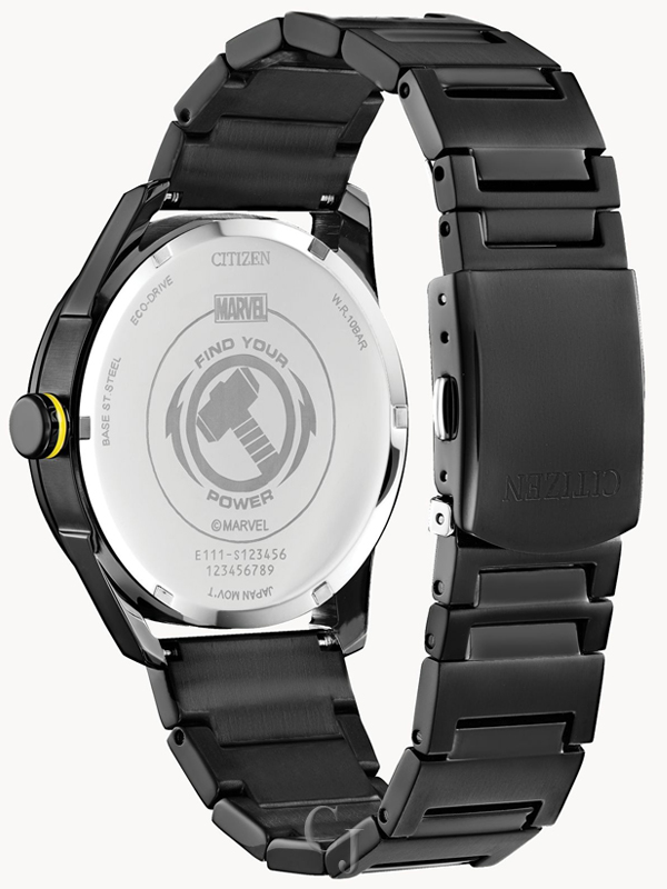Bring the mighty hammer down with this new men’s watch from Citizen’s Marvel Classic Avengers collection, Thor. The mighty God of Thunder’s power stands out in the distinctive 3-hand black dial with yellow accents that features luminous hammer head hour markers that appear to be in motion circling the dial as dynamic lightning bolts dart through the center of the dial crossing the watch face. The black stainless steel bracelet has a fold-over clasp with push buttons. The case back highlights the thundering authority of the Norse God with the words, “Find Your Power,” engraved around an etching of a hammer enclosed by lightning bolts. This exceptional watch for Marvel collectors and serious Thor fans alike also features Eco-Drive technology and is powered by any light, but maybe avoid lightning bolts.