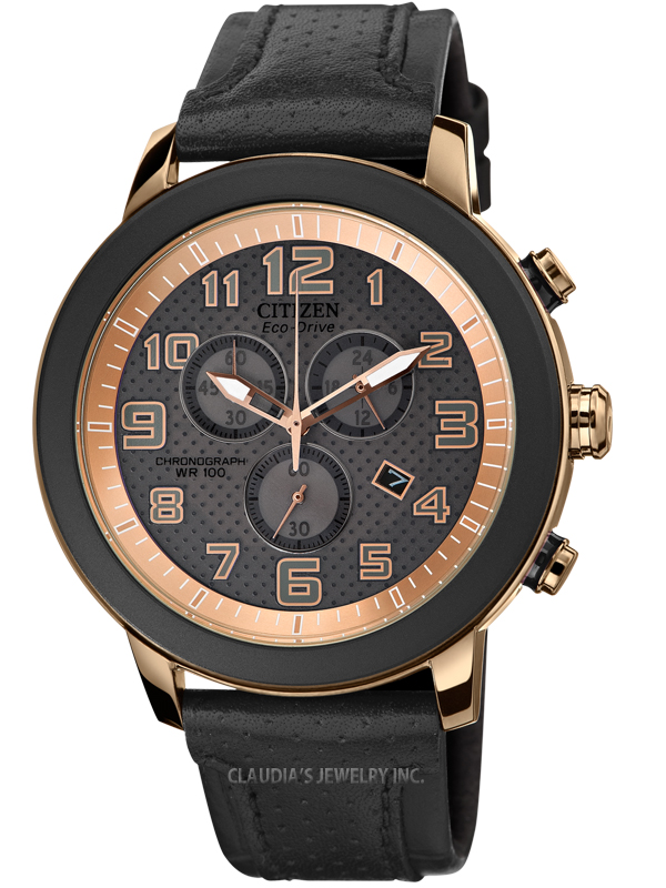 Citizen Eco-Drive technology harnesses the power of light – from any natural or artificial light source and converts it into energy which is stored in a permanently rechargeable lithium-ion cell. It recharges continuously in any kind of light to run forever. Cool black infused with warm rose gold-tone stainless steel makes this chronograph a chic option for a night on the town. Additional features include a 1-second chronograph that measures up to 60 minutes, 12/24 hour time, date feature and water resistance to 100 meters.