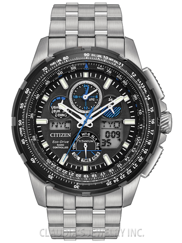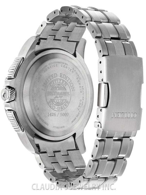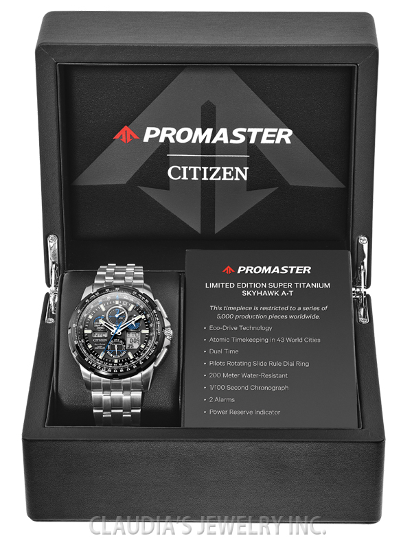 Redefining atomic timekeeping, in the Promaster Collection, with a turbine inspired bold and powerful design. The newest edition, limited to 5,000 pieces, is the CITIZEN Limited Edition Super Titaniumâ„¢ Skyhawk A-T. A remarkably dynamic and visually appealing timepiece featuring chronograph, perpetual calendar, dual time, alarms, countdown timer, digital backlight and UTC displays, power reserve and pilot’s rotating slide rule bezel. This model appears in Super Titaniumâ„¢ with black dial and bright cobalt blue accents.Featuring our Eco Drive technology – powered by light, any light. Never needs a battery. Caliber number U680. FUNCTIONS: U680, Atomic Timekeeping Technology with Synchronized Time Adjustment Available in 43 World Cities, Synchronized to Atomic Time Clock for Superior Accuracy, Atomic Timekeeping Technology with Synchronized Time Adjustment Available in 43 Cities, 1/100 Second Chronograph Measures up to 24 Hours