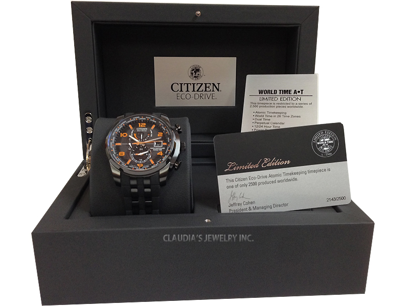 Bold, aggressive, and dimensional, Citizen Eco-Drive introduces its newest timepiece with atomic timekeeping. This World Time A-T limited edition features Atomic Clock synchronization for superior accuracy, keeping time in 26 time zones. In black ion plated stainless steel with orange accents on the dial, the polyurethane strap has metal inserts for added durabilty. Limited production of 2500 pieces worldwide. Featuring our Eco-Drive technology – powered by light, any light. Never needs a battery. Caliber number H820.