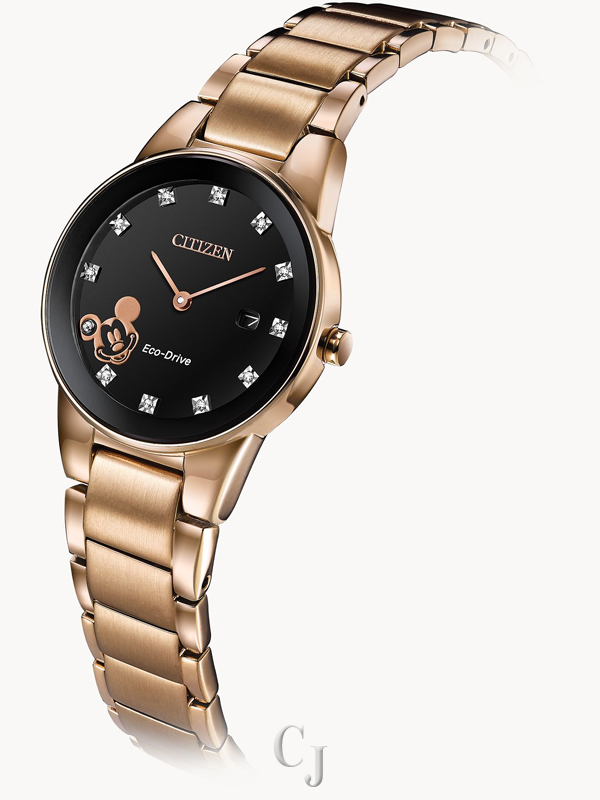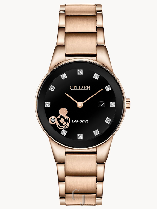 A recognizable silhouette with a recognizable mouse. The new Ladies’ Mickey Mouse timepiece by Citizen features the iconic mouse on a clean black dial with edge-to-edge glass. Showcased in a rose gold-tone stainless steel case and bracelet, black dial with diamond markers. Featuring our Eco-Drive technology – powered by light, any light. Never needs a battery. ©Disney