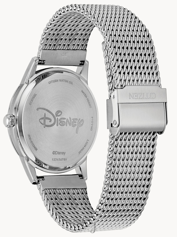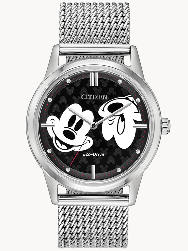 Fun, love and optimism. Memorable attributes of a timeless Mickey Mouse, and now the new Unisex Mickey Mouse watch by Citizen, with the friendly face of Mickey himself embossed on the dial. Featured in a stainless steel case and mesh bracelet and black dial. Featuring our Eco-Drive technology – powered by light, any light. Never needs a battery. ©Disney