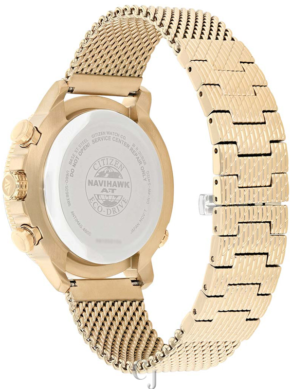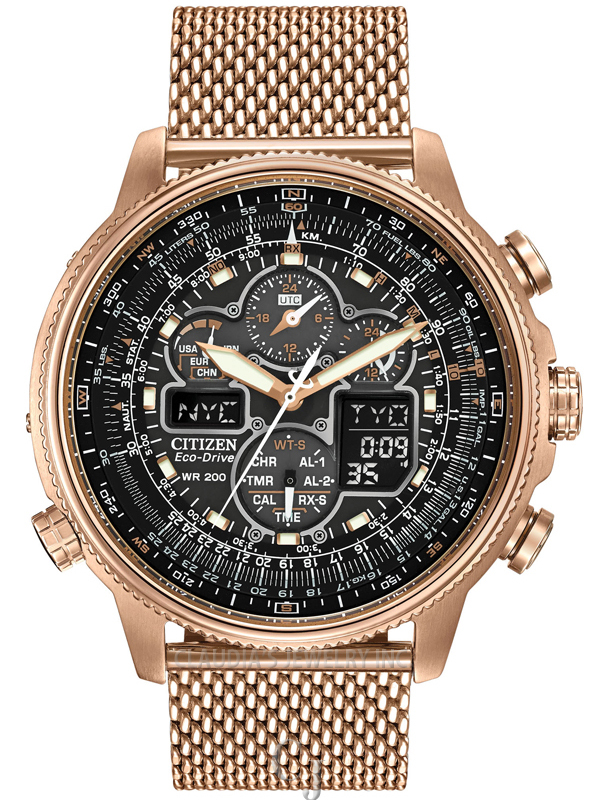 Go where the wind takes you with the Citizen Navihawk A-T. With atomic clock synchronization for superior accuracy, this perpetual calendar chronograph receives radio signals both automatically and on-demand in North America, the United Kingdom, Europe, Japan and China. The Navihawk A-T ensures you are always on time, no matter where your journey takes you. The rose gold-tone stainless steel case and mesh bracelet with black dial features world time in 43 cities, 2 alarms, 1/100-second chronograph, 99-minute countdown timer, UTC display, power reserve indicator, hand correction and shock sensing function.