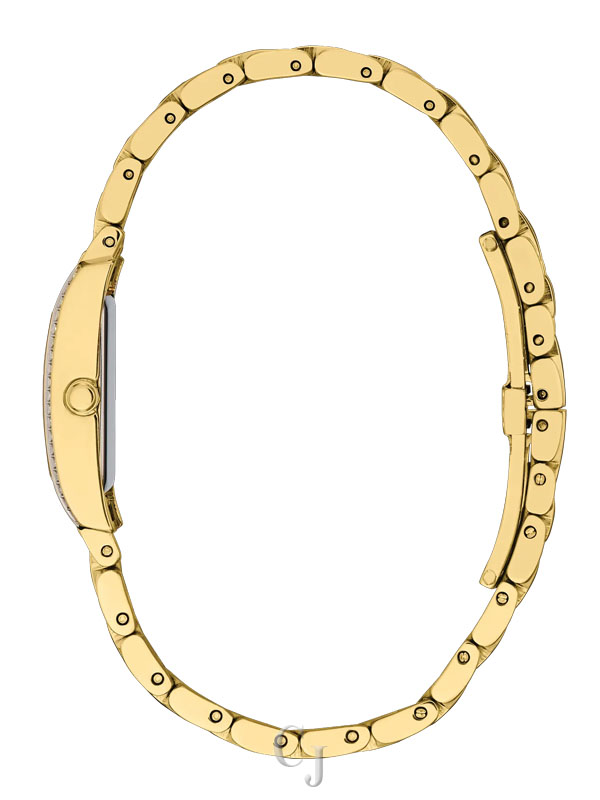 Inspired by the elegant, elongated shape of the original, the Petite Palidoro reissue is the latest women’s watch in our Dress Classic collection and is the perfect complement for elegant wear. On the wrist, the timepiece measures 28mm in gold-tone stainless steel, with its rectangular form accented by crystals on either side of the bezel and a lovely geometric crown. A matching five-link bracelet effortlessly secures the watch to the wrist.