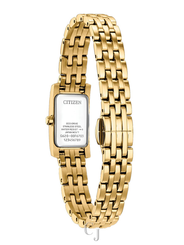 The white mother-of-pearl dial is as much an exercise in sophisticated art deco as the case, with stylized indices in black being framed in creative fashion while shortened hour and minute hands indicate the time. Sustainably powered by any light with our proprietary Eco-Drive technology that never needs a battery, this elegant ladies’ watch is the perfect addition to any look. Caliber G620.