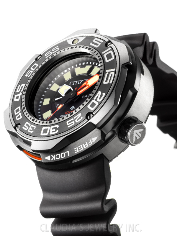 Ready, Set, Dive. Take your timepiece to new depths wearing the Promaster Professional Diver 1000M. This brand new dive watch from Citizen contains all the necessities for an avid diver. Featured with black polyurethane strap, Super Titanium™ case with black dial, ISO compliant, helium release valve, power reserve indicator and one-way rotating elapsed time bezel with lock. Featuring our Eco-Drive technology – powered by light, any light. Never needs a battery. Caliber number J210.