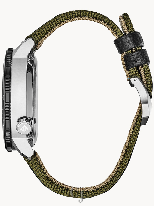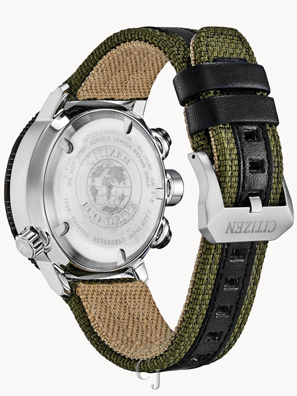 Climb to new heights with the Promaster Altichron. Designed with CITIZEN’s light power technology, the sky is the limit when wearing this innovative, sleek yet sporty timepiece. With an altimeter measuring from 1,000ft – 32,000ft, compass and date, its the absolute timepiece for any semi-professional adventurer. Featured with a black ion-plated stainless steel case, comfortable olive green ballistic nylon strap with black calf inlay, black ion-plated stainless steel rotating bezel and complimentary olive green dial. Featuring our Eco-Drive technology – powered by light, any light. Never needs a battery. Caliber number J290