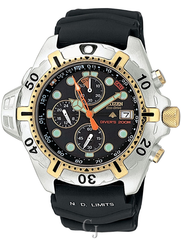 The ISO-certified Promaster Depth Meter Chronograph features a 50-minute chrono with depth display to 125 feet, max depth memory, power reserve indicator, 12/24 hour time, lum hands and 200M WR. In stainless steel two-tone with 1-way rotating elapsed-time bezel, screw-back case & screw-down crown, non-reflective crystal, 48mm case, and poly strap. Featuring our Eco-Drive technology – powered by light, any light. Never needs a battery. Caliber number B741.
