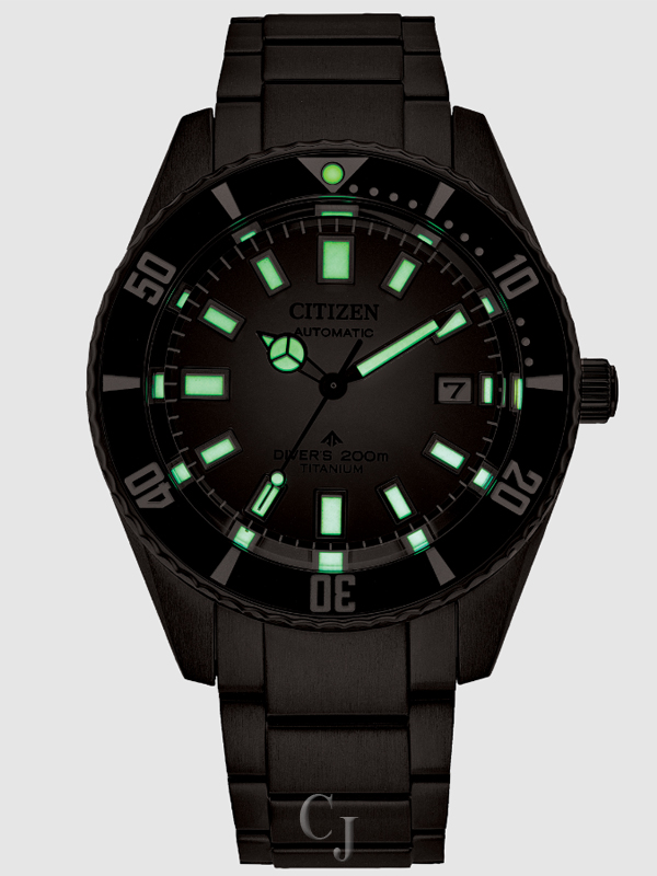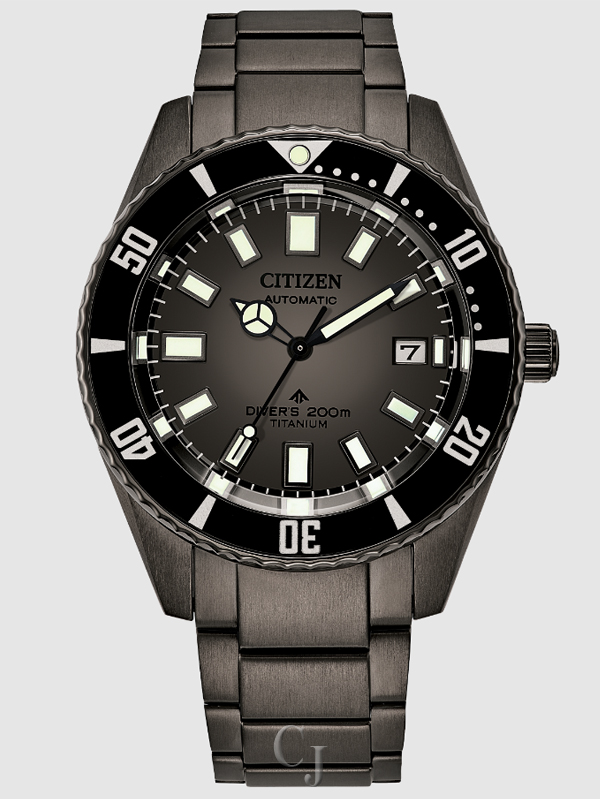 Submerge yourself in a new collection of Automatic Dive watches with a deep connection to Citizen’s history of innovation and proprietary technology. The new Promaster Automatic Diver 200M watch features Citizen’s Super Titanium™ construction with DLC coating that is both lightweight and ultra-durable. Measuring 42mm in diameter, the black case has an easy grip, rotating bezel and matching black titanium bracelet. The robust case surrounds a graduated gray dial with bright luminous hands and markers, contrasting nicely with the dark case and bracelet for a strong aesthetic of sport style and performance. This technically advanced and automatic sport watch is ISO compliant with a screw-down crown and water resistant to 200 meters. Caliber 9051.