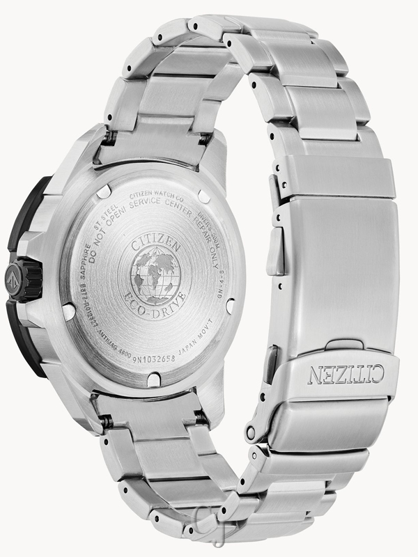 A fully-featured dive watch with a splash of color, the Promaster GMT Diver with Eco-Drive technology from Citizen is the total package. The stainless steel band and black dial are accented with red and blue for a bold look that stands out from the crowd. This timepiece features an anti-reflective sapphire crystal face, dive grade luminous hands and markers, anti-shock, anti-magnetic, dual time and a rotating bezel.