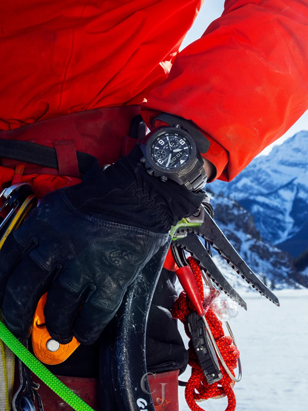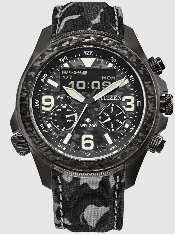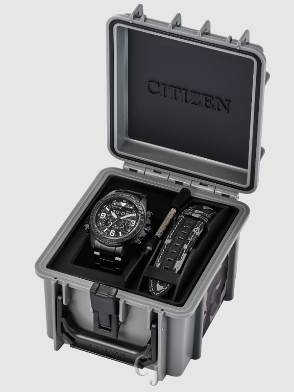 The limited-edition Promaster Tsuno Chrono Racer is the latest addition to our Promaster collection in a striking design inspired by Citizen’s racing roots. The distinctive chronograph features a deep blue dial with red accents on a Super Titanium™ case, which is 5x harder and 40% lighter than steel, scratch- and rust-resistant. It has a hand-assembled movement and advanced features that have been updated to reflect a racing aesthetic, including a power reserve indicator resembling a fuel gauge, and the 60-minute chrono dial designed to look like a speedometer. The perforated black leather strap further emphasizes our racing roots. Other features include a tachymeter, an alarm, and a flat sapphire crystal. Like other watches in the Promaster line, it is water resistant up to 200 meters, and sustainably powered by any light with our Eco-Drive technology that never needs a battery. This collector’s watch comes in an exclusive blue chrome Promaster tackle box with a leather watch roll. Caliber E210.